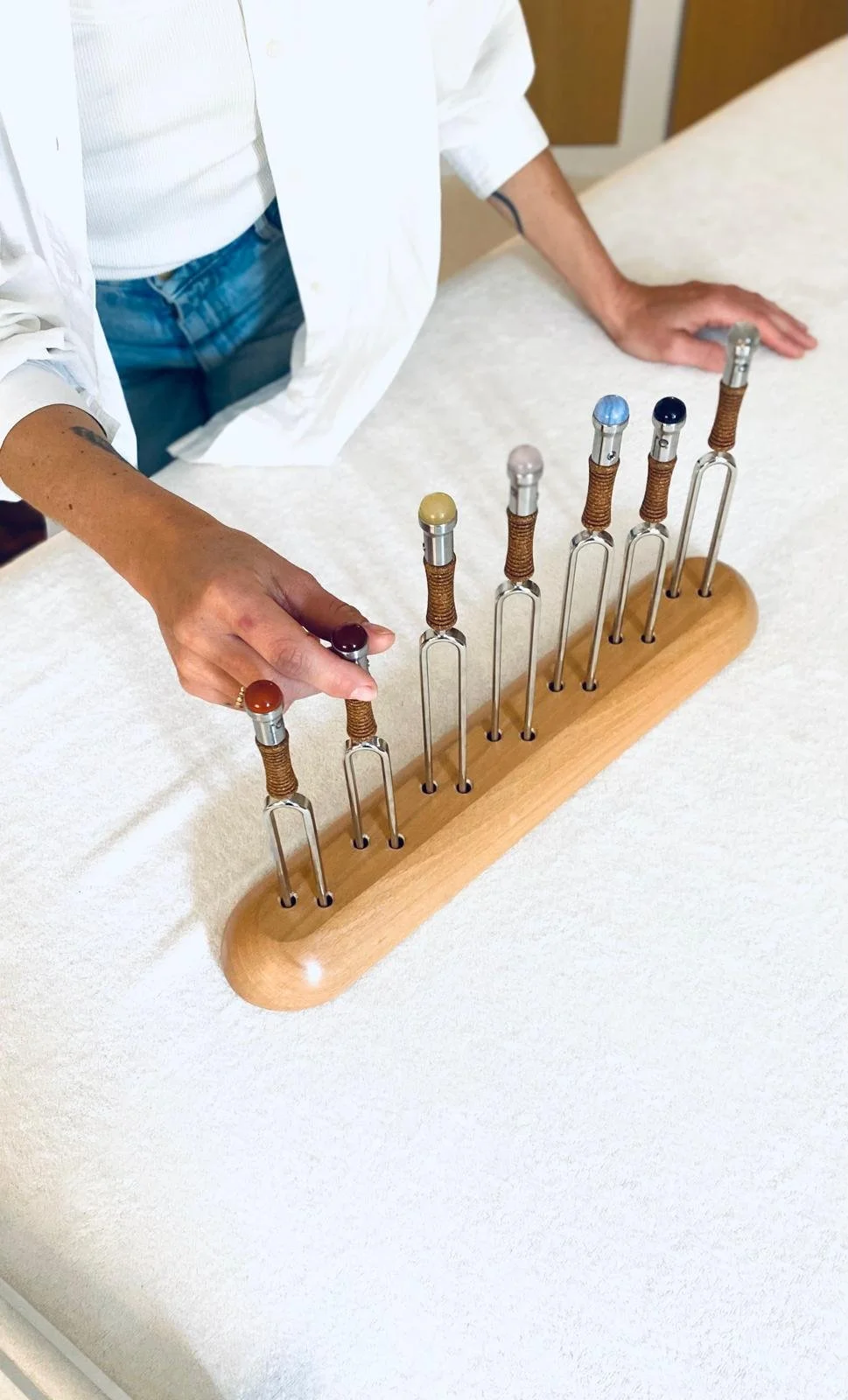 Diapasons thérapeutiques & chakras — posés directement sur le corps comme le ferait un acupuncteur avec ses aiguilles, ils ciblent avec précision les zones de tension pour les délier et restaurer un équilibre profond.